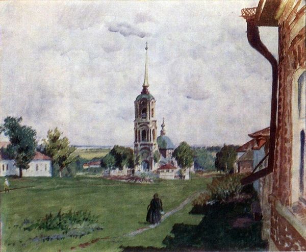 Editor: Vasily Vereshchagin's oil painting, *Monastery Tower*, feels…isolated, maybe even a little forlorn. The tower dominates the composition, and that lone figure walking toward it only emphasizes its imposing scale. What strikes you most when you look at this piece? Curator: It is tempting to only see the aesthetics, but let's consider this in its historical context. Vereshchagin was a war artist, and while this isn't overtly a war scene, the monastery—historically a place of refuge and power—can be viewed through the lens of societal power structures. The starkness could symbolize the artist’s commentary on the Church’s role, its presence looming large in the lives of the people. Editor: So, you're seeing the architecture not just as buildings, but as symbols of influence? That’s interesting, I hadn’t considered that. Do you think the figures near the background reinforce this idea of social hierarchy and its influence upon the Russian public? Curator: Precisely! Notice how small the figures are in comparison to the tower. Is this possibly a commentary on faith, the social order, and Russia’s position within the historical power dynamics of Europe? Considering that he painted the piece later in the 19th century as reform movements and revolutions are happening. The image suggests questions. Does it embrace the familiar authority, or suggest questions about it? What is your view on that, now? Editor: That completely changes my perspective! Before, I was just seeing a building, but now I recognize it as a symbol with embedded social meaning, especially within its historical setting. Thanks for your insight! Curator: The point isn’t to provide answers, only to provoke the correct questions, to inspire debate in how we consider historical artwork. Looking again at Vereshchagin's work I now consider this a study in light and social power.
