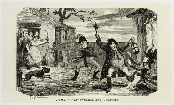 George Cruikshank created this steel etching, "July - Summary Proceedings," as part of The Comic Almanacks series between 1835 and 1853. The monochromatic scene, bustling with figures in a confined space, evokes a sense of chaotic energy. The composition is dense with detail, from the ornate decorations on the walls to the intricate patterns on the floor. Cruikshank uses line and shading to create depth. The characters are rendered with exaggerated features, emphasizing their emotional states and social roles. The central figure stands out as a focal point, gesturing emphatically while engaging with another character who appears to be resisting. Cruikshank's satirical approach, combined with his mastery of etching, highlights the social dynamics and power relations within the scene. The work can be seen as a commentary on the theatricality of social interactions. The artist destabilizes established meanings by presenting a chaotic vision that exposes the artifice inherent in social proceedings.