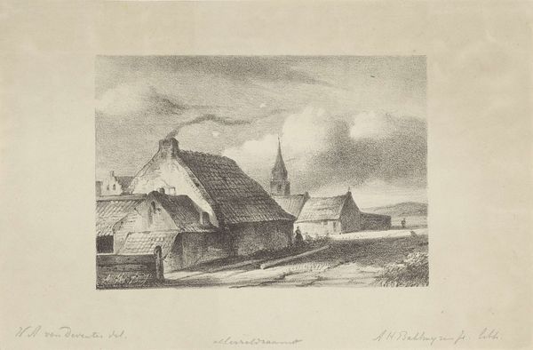 Curator: Here we have Geertruydt Roghman's "Het Dorp Spaerwouw," a small etching held here at the Harvard Art Museums. Editor: It's a wonderfully stark image. The contrast creates a strong sense of light and shadow, and the landscape feels open, almost melancholic. Curator: Roghman, despite her early death, was a master of etching, capturing the nuances of Dutch rural life. The church steeple, the thatched roofs—these are powerful symbols of community and permanence. Editor: Absolutely. And the way she uses hatching and cross-hatching to suggest texture is remarkable. Look at the variations in the sky alone. It is very skillfully done. Curator: Indeed. This village scene evokes a deep connection to the land, a cultural memory of simpler times. The figures, small and anonymous, speak to a shared human experience. Editor: I am struck by how Roghman uses line to create depth. It's quite sophisticated for such a seemingly simple composition. Curator: This piece provides a small window into a moment in history. Editor: A deceptively simple composition, really.