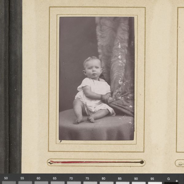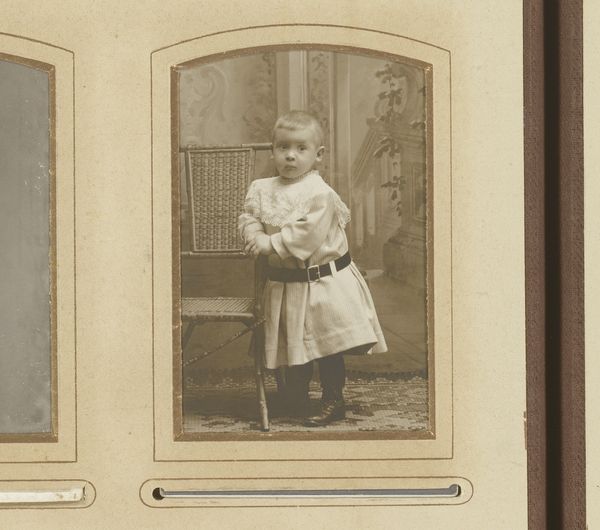 This photo, *Portret van een staande jongen met boek*, made by Atelier Wertheim, captures a young boy holding a book. The grayscale palette emphasizes the texture and form of the boy's clothes and the simple geometric shapes in the composition. What I find compelling is how the tones capture the soft light and shadow, giving a real depth to the image. Look at the slight blur around the edges of the boy's hair. It speaks to the movement and fleeting moments of childhood. The studio setting is quite sparse. There is very little to distract from the boy and the book that he is clutching. This image reminds me of some of the portrait work by Judith Joy Ross, which explores similar themes of innocence and the quiet dignity of childhood. Like Ross's work, this photo invites us to reflect on the transient nature of time and the enduring power of the photographic image. It's a piece that invites multiple interpretations.