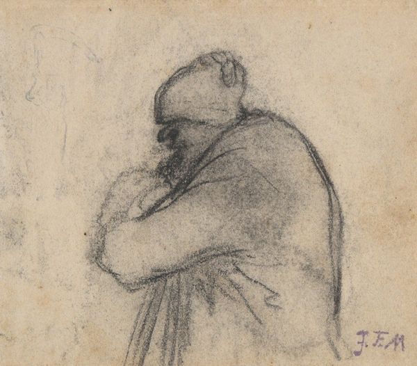 Curator: We're looking at Jean-Louis Forain's drawing, aptly titled "Politician". Editor: Well, “aptly” indeed! The immediate impression is one of heft – both physical and perhaps metaphorical. The weight of responsibility, the bulk of power, rendered in deceptively simple lines. It’s primarily the cross-hatching at the base that strikes me most. A frenetic yet simple markmaking system using what seems to be solely one material: sanguine. Curator: I think your perception about the metaphorical weight is key here. Sanguine, traditionally associated with choleric temperaments, infuses the drawing with a palpable energy and possibly corruption. Editor: I hadn't considered the association of sanguine with temperaments, interesting. But it does draw attention to the artistic process, the choices made in material and line to convey the politician's persona. One must wonder why sanguine specifically was employed. Curator: Precisely! Consider the history of sanguine in portraiture. It’s a very fleshy medium, suggestive of the corporeal, linking the politician to earthly desires. In the 19th century, caricatures and depictions of politicians often employed such exaggerated features. Editor: The exaggeration certainly exists here, if one only looks at the figure's outline. There are clear academic underpinnings to the structure; still, one would never expect to come across a drawing so… raw in this way. The cross-hatching doesn’t attempt to define, it complicates. And it leaves areas unfinished and exposed, giving the subject a vulnerability that disrupts any preconceived notions. Curator: I agree. He has a somewhat exposed aspect, yes. A far cry from the stiff and polished portrayals meant to glorify leaders of the state. Perhaps that disruption is the point; the symbol itself laid bare by artistic execution. Editor: An incisive observation. I would only add the drawing material brings forward a tension inherent within power: constructed appearances cannot, at their core, hide reality or intention. It’s a constant game of façade versus raw expression. Curator: Exactly. Art enables us to hold up mirrors to the power dynamics of society, even today. Editor: And sometimes it does so with only the simplest of materials, pushing past the idea of artistic virtuosity and arriving at the pure heart of the issue at hand.