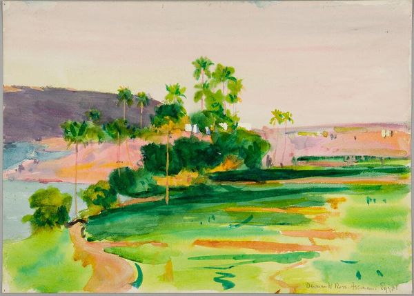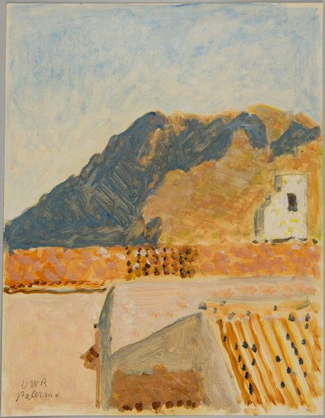 Curator: Denman Waldo Ross's watercolor, "Landscape, Orizaba, Mexico," presents a captivating scene. I'm immediately struck by the layering – the bold terracotta roofs contrasting with the distant, hazy mountain. Editor: It feels almost dreamlike, doesn't it? The watercolor technique lends itself to this sense of ethereality, but I wonder about the politics of landscape, of whose gaze is represented. Curator: Absolutely. Ross was deeply engaged with the materiality of art-making and its relation to the decorative arts. The brushstrokes themselves reveal a focus on the process and on the use of watercolor to its full potential. Editor: And it's impossible to ignore the colonial undertones inherent in a landscape painting of Mexico by an American artist. This image participates in a long history of representing "other" cultures, a visual appropriation, if you will. Curator: True, but he approached landscape with an interest in color theory. This wasn’t just documentation, but an exploration of artistic principles through the medium. Editor: Perhaps. It's a beautiful work, but one that invites deeper reflection on the historical power dynamics at play. Curator: Indeed. There's a tension between artistic exploration and the socio-political context. Editor: Exactly, a dialogue that makes this little watercolor so compelling.