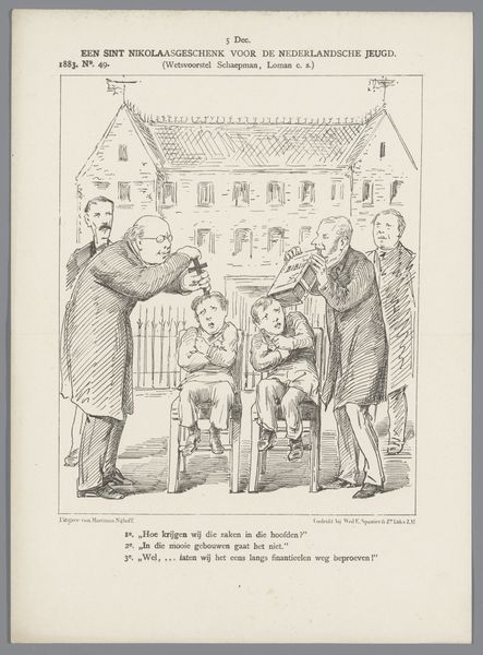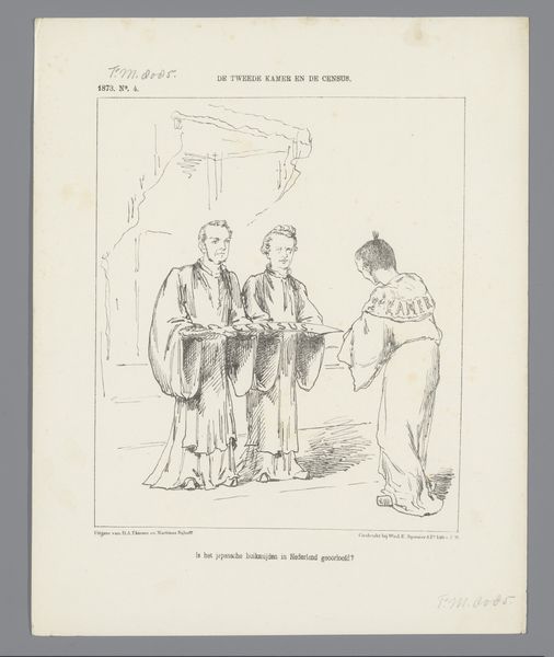 This is a political cartoon made in 1872 by Johan Michaël Schmidt Crans, titled "Spotprent op debatten in de Tweede Kamer over de troonrede en de gelijktijdige duivenwedstrijd," which translates to "Cartoon on debates in the House of Representatives about the Speech from the Throne and the simultaneous pigeon race." It was made using etching. This image encapsulates the political climate in the Netherlands at the time. The cartoon links parliamentary debates to the popular pastime of pigeon racing, critiquing the politicians of the time. The central image of a basket labeled "Troonrede," or Throne Speech, from which doves are released, suggests the futility or perhaps the symbolic freedom associated with royal announcements. The presence of seemingly indifferent politicians further satirizes the distance between governance and public engagement. By examining periodicals, newspapers, and parliamentary records from the period, one can piece together the social, economic, and political issues at stake in the Netherlands at this time. Political cartoons are invaluable for understanding the popular sentiment. They give us insight into public opinion and the social conditions that shaped artistic production.