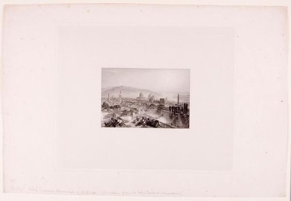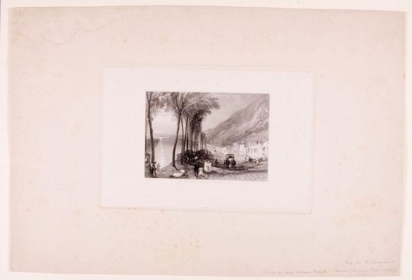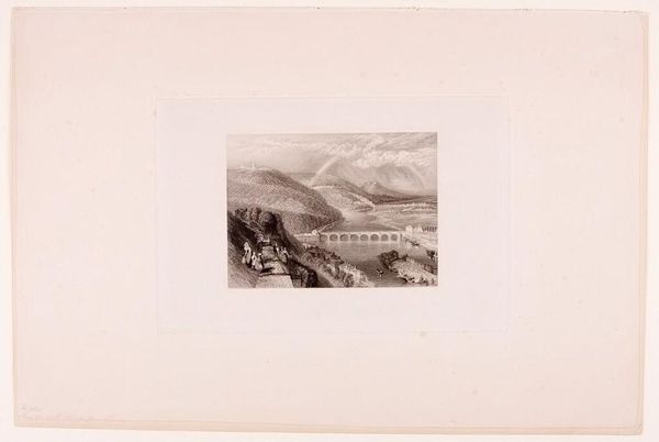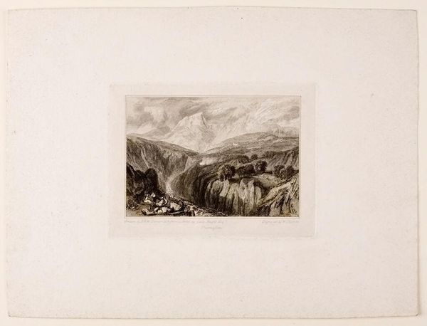 Curator: This is William Finden's "The Drachenfels." A rather dramatic rendering, wouldn't you agree? Editor: Indeed, quite brooding. The looming rock face evokes a sense of the sublime—nature's imposing power. Is there a particular symbolic weight here? Curator: The Drachenfels itself, legend tells, is where Siegfried slew the dragon. The romantic era would embrace that symbolism of overcoming the monstrous. Editor: The visual contrasts – the sharp, dark lines of the foreground against the softer, hazier mountains – create a compelling visual rhythm. The light feels intentionally manipulated. Curator: Perhaps pointing to the story being one of many interpretations, with each person bringing their own vision to the tale. Editor: A beautiful reminder of how even familiar landscapes can be imbued with potent, timeless meanings. Curator: Yes, a testament to Finden's skillful rendering of space and myth.