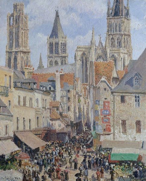 Eugène Boudin captured this scene with oil on canvas, depicting the Rue et Église Saint-Vulfran in Abbeville. The cathedral looms large, an emblem of spiritual and temporal power, deeply rooted in the medieval psyche. Note how Boudin positions the church at the end of the road, drawing the viewer's eye, an urban Via Sacra. This architectural dominance echoes through time, recalling the ziggurats of ancient Mesopotamia, symbols of humanity's yearning for the divine, reimagined in a Christian context. Consider the presence of nuns on the left, figures shrouded in black. They evoke the collective memory of religious devotion but also a certain melancholy, a retreat from the bustling street scene. This juxtaposition creates a tension, a visual metaphor for the soul's struggle between worldly life and spiritual aspiration. The image pulls us into a subconscious dialogue between faith, architecture, and the human condition.