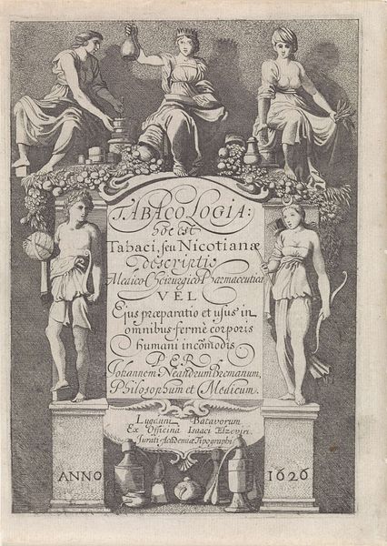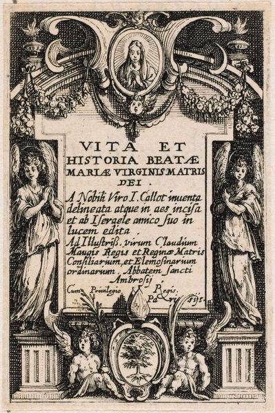 Curator: This is Jacques Callot's frontispiece to "Gloriosisimae virginis deiparae elogium". Editor: What a flurry of activity—and all packed into such a small space. I am immediately struck by the density of the engraving. Curator: Callot, active in the early 17th century, crafted this work as an introduction to a devotional book, meant to honor the Virgin Mary. Its placement indicates the role of the church in art's creation. Editor: You can almost feel the pressure of the press pushing the paper into the etched lines. It’s clearly designed for mass production, yet filled with detail only visible up close. Curator: The surrounding vignettes depict scenes from the life of the Virgin, framed by allegorical figures. Each image tells a story, reflecting the cultural importance of religious narratives at the time. Editor: I like thinking about all that ink, the precise action of the engraver’s tools, and the embodied knowledge that went into producing this piece. Curator: This piece provides a glimpse into how religious and political forces shaped the creation and consumption of images. Editor: Indeed, it's a reminder that even devotional images are made, and their making matters.