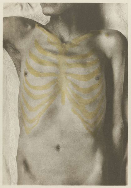 Curator: Here we have "Untitled, from Omizuoa" by Masao Yamamoto, created in 2003. It's a photograph. Editor: My first impression? Intimate and kind of haunting, like a forgotten memory pulled from a drawer. The stark contrast creates an interesting focal point...or maybe I should say a non-focal point because the artist crops the subject. Curator: Exactly. Yamamoto often uses a soft focus and limited tonal range in his photographs, which lends itself to creating the sense of timelessness. Think of it in connection to the concept of *memento mori*, which frequently surfaces in art as a cultural symbol or ritual observance across various eras. In his work, one can feel its quiet and reflective essence. Editor: Memento mori… reminds me of when my grandmother used to dry flowers – same idea. You know, keeping a tiny, withered bloom just because it held some brief flicker of life. In the nude, the dark background sort of consumes the figure... almost like it's being erased, but what is visible seems more vivid, you know? It has some weird sense of urgency. Curator: That's a compelling reading. Consider also the series' title “Omizuoa”, an invented, evocative word, suggesting mystery and untold narratives. This body is reduced to near abstraction: light against dark. Its anonymous nature allows for universal reflections on the transient quality of the human form. It makes us consider our past and our potential. Editor: Potential is a beautiful reading that gives another edge to the photographic piece! I still see the figure fading; what if, conversely, Yamamoto captures the very emergence of something real, something eternal, maybe even through this erasure? Kind of like a digital artifact turned inside out? It brings something else to consider in photography... What it makes possible... What is truly possible in life? Curator: Precisely. The image plays with what is seen, what is not, and what remains – it really is open to a diversity of subjective, even conflicting, interpretations. It resonates with a broader cultural fascination with memory, ephemerality, and what it means to capture time in art. Editor: And in the end, maybe that's the most intriguing part of it, that both fading and potential birth are both in constant conversation on this evocative piece. Curator: A most suitable encapsulation of it! Thank you for this most wonderful moment.