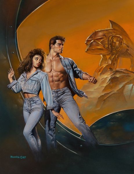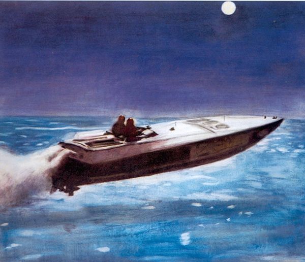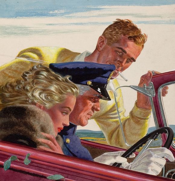 Robert Peak created this painting, "In the Spotlight," during an era when his work was synonymous with the visual culture of American entertainment. The painting captures the dynamism of a male-female figure skating duo, presenting a narrative of partnership, athleticism, and grace. What does it mean to present this dance, on ice, as a heterosexual partnership? How are traditional gender roles reinforced or challenged by the performance? The male skater is positioned in the back; the woman is at the fore, seemingly taking up more space. The emphasis is on the beauty and spectacle of the performance, yet one can ask how the intense training, dedication, and physical demands of the sport reflect the cultural values of discipline and achievement. Peak captures a moment of transcendent athleticism and artistry, inviting us to reflect on the narratives we construct around sports, identity, and performance.