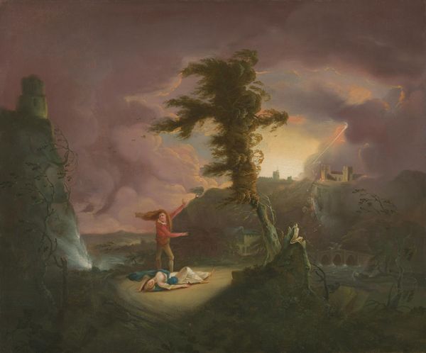 Curator: Let's explore Thomas Cole’s 1840 work, “The Voyage of Life: Manhood,” rendered with oil paint. What strikes you about it? Editor: The roiling water and the looming darkness create such a feeling of dramatic tension, almost foreboding. The golden vessel seems so fragile against that overwhelming landscape. Curator: Indeed. The very material of the painting, the layered oils, lends itself to creating that turbulent atmosphere, almost as if the pigment itself embodies struggle. Note the brushstrokes used to build the tumultuous river. The application is anything but smooth and gentle. It is active and engaging and suggests both skill and deliberate handling to show inner emotional experiences of life and the exterior challenge of that emotion as the 'Man' sees it in reality. Editor: Absolutely, and that active struggle plays out on a symbolic level too. Look at the figure— he's standing tall, with a hand raised, but toward what? There's a sense of determination but also vulnerability, a call into the unknown perhaps. The 'angel' and its light feels farther off as it blends in with clouds. Curator: The luminosity is achieved through layering, thin glazes painstakingly applied over time. Cole, an immigrant himself, painted for an emerging American market and that this type of 'allegorical' theme resonated reveals much about the time's social landscape of moral expectation of being raised right. There are very detailed rocks in the distance showing 'obstacles', while we know from experience, the real labor required to keep this 'dreamy voyage' afloat often fell on laborers far removed from these kinds of paintings! Editor: True. Yet the image endures. The symbol of the river, the journey... they tap into universal themes of ambition and confrontation that linger across many cultures. Curator: An ambitious journey visualized, layer upon layer of oil and meaning for that very human spirit of survival against elements both material and internal. Editor: It makes you wonder where this tumultuous river will lead, what symbols await at the next bend, in this 'voyage of life'.