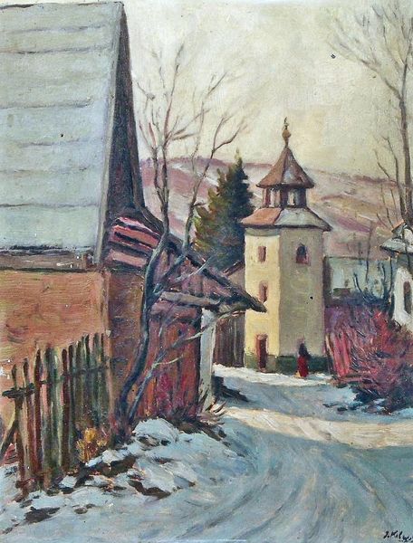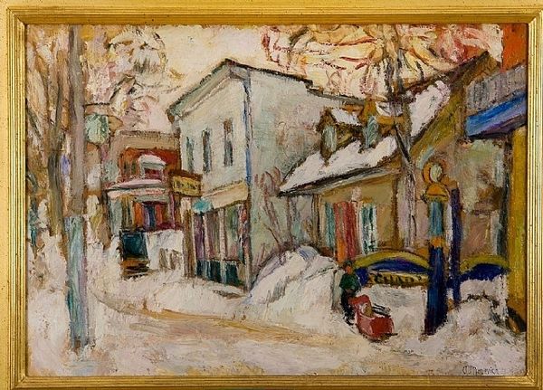 Curator: What a disquieting scene! I immediately feel this somberness through the muted colors. Everything feels very transient. Editor: Yes, there is an undeniable moodiness to it, a kind of industrial melancholy. We're looking at "A Street in the Bronx," an oil painting by Abraham Manievich, known for his impressionistic style, and seemingly done en plein-air. It is, in effect, a landscape. Curator: Interesting that you use the word landscape, because what jumps out at me are these leafless trees. They strike me as symbolic, a representation of seasonal loss and the stillness of winter or perhaps an autumn wasteland in a bustling borough. It recalls earlier landscape painters working to depict the cycle of nature. Editor: Perhaps, but I’m drawn more to what’s human-made, which speaks more about our society: the buildings, the trolley. These elements speak volumes about urbanization and the lived experience in a rapidly evolving city. I find myself wondering who lived in those buildings, rode that trolley? What were their stories? Were they as transient as these starkly depicted trees? Curator: See, I am fascinated by those skeletal branches! The bare tree as an image is incredibly powerful. They reach upward, yes, toward the sky, toward heaven even, but also function as conduits or connectors between the terrestrial world and a celestial sphere, hinting at something larger than the urban landscape. This streetscape seems more to evoke introspection, the way Caspar David Friedrich might use nature to create sublime metaphors of human existence. Editor: But Manievich positions this street scene in The Bronx. What about the narratives inherent to this particular place? This borough’s history with immigration, socioeconomic stratification, public transportation struggles. The trolley in particular— what kind of access did it provide to whom, and who did it leave behind? We can’t just bypass social and political history when the landscape includes such loaded iconography. Curator: You offer an important and vital way to view the painting in its cultural context! Still, I keep going back to the basic human longing it presents – for connection to something spiritual. I keep considering the deeper meaning these elements carry through time and collective consciousness. Editor: I see what you mean. And considering The Bronx specifically, a space where the tension between urban decay and communal hope plays out, the image resonates with layered and symbolic complexities that prompt a variety of readings.