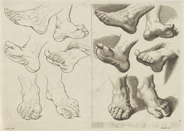 Editor: This drawing, "Laokoons venstre fod og den ældste søns højre fod" by Willem Panneels, dating from 1628-1629, shows two feet rendered in precise detail with pencil. The stark realism is captivating, almost unsettling. What do you see in this piece beyond the technical skill? Curator: It's crucial to recognize the context. Panneels was studying ancient sculpture, specifically the Laocoön. The drawing served a dual purpose. On one hand, it was about mastering form, demonstrating artistic skill according to the academic standards of the time. On the other, it reflects the fascination with classical antiquity that pervaded the era. How might studying and disseminating images of such revered classical sculptures impact artistic production in the 17th century and beyond? Editor: So, this wasn't just about drawing feet; it was about power dynamics within the art world. The artist gains authority through replicating a known symbol of art history? Curator: Precisely! Think about who had access to the Laocoön and who then interpreted and disseminated that access through drawings. Also, how does choosing to represent only *parts* of the original sculpture shape our understanding and engagement with it? Editor: It reframes the narrative, depoliticizes it almost. It removes the drama and focuses on idealized form instead. It's interesting how the pencil, a humble tool, plays a role in that elevation of artistic standards. Curator: Yes! And consider the political implications of who controls those standards. This seemingly simple drawing engages with complex questions of artistic authority, access, and the enduring influence of the classical world. What does this new perspective make you think about the museum’s role in exhibiting pieces like this today? Editor: I now realize the museum doesn't just *show* the drawing. It presents a whole discourse about the appropriation and politics of art, opening avenues for many voices.