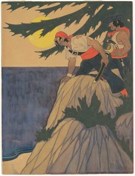 Ivan Bilibin made this illustration for the Russian fairy story "Salt" using watercolor and ink, I imagine, with such precision in the details. The colours are so earthy, ochres and browns, like a landscape in themselves. They make me think about how stories are made, passed down, like the earth itself: layered, built up over time. Look at the giant’s beard, all those tiny hairs, each one a little mark. Or those parallel waves edged in foam. It's meticulous. There's a contrast between the controlled lines and the wildness of the subject. Giants, dolphins, and tiny men riding on shoulders across the sea. It reminds me of Arthur Rackham, another master of illustration, but with a distinctly Russian flavor. It's a reminder that art is always a conversation, echoing and transforming the ideas of others. There’s no single way to read it, just different paths we can take through this visual tale.