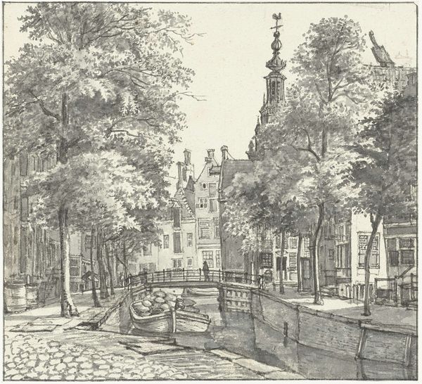 Editor: This is "View of the Tower called Jan Roodenpoortstoren and the Singel Canal in Amsterdam," made between 1770 and 1814 by Jonas Zeuner, a watercolor painting. I'm immediately struck by its stillness; it feels like a very precise recording of a specific moment, almost like an early photograph. What do you see in this piece? Curator: I see a fascinating dance between order and emotion, expressed through symbols that have persisted through time. The architecture, rendered with such precision, speaks to a desire for permanence, for civilization's mark. But note the sky; those voluminous clouds carry a weight, don't they? They symbolize the intangible – memory, longing, perhaps even the divine. Editor: So, you're saying the architecture is a symbol? That makes sense. Is there significance to the tower itself? Curator: Absolutely. Towers, historically, have been potent symbols. Consider their phallic nature, their assertion of power and aspiration, their suggestion of a bridge between the earthly and the celestial. They served as landmarks, reminders of communal identity in a world before instant communication. Is there a bridge or are we already on the cloud? What is holding the earth in its place if the towers disappear in a second? Editor: I hadn't considered all those layers! It's interesting how Zeuner combines those solid architectural forms with the more ethereal quality of the sky. Curator: Precisely! And the Singel canal itself—water, a symbol of life, movement, but also of reflection and the unconscious. What does the canal mirror for those walking along its edge? Perhaps the viewer is drawn to interpret life itself as reflected through memory and continuity. What will we reflect after we die? What is to be inherited and memorized in time? Editor: That makes me see the whole scene in a new light. It’s more than just a pretty cityscape; it’s a meditation on history and permanence. Curator: Indeed! Each element contributes to a layered narrative, echoing cultural values that transcend Zeuner's time. Visual storytelling preserves cultural continuity through shifting aesthetic tastes, creating a beautiful paradox for later audiences.