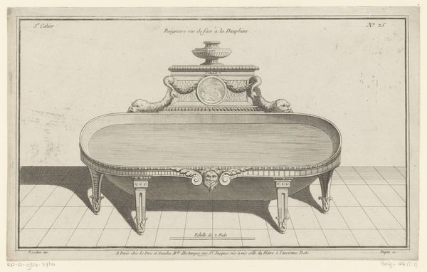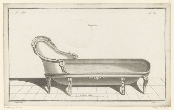 Curator: Oh my, what have we here? It's rather sterile, yet undeniably elegant in its own way. Editor: We're looking at an engraving entitled "Bath with Mermaids," made sometime between 1772 and 1779. The piece resides here at the Rijksmuseum, of course. Curator: It's…clinical, almost like a blueprint. Is this neoclassical restraint pushed to its absolute limit? Where’s the life, the pulse, the sheer exuberance? Editor: It is intriguing, isn't it? I find a powerful statement in the precision, the deliberate lack of ornamentation. Consider the mermaids—they're less creatures of whimsy and more architectural elements. Almost like caryatids supporting the central fountain. Curator: They seem oddly detached, don't they? Like the idea of myth, rendered emotionless and devoid of connection. Editor: Perhaps the piece speaks to a certain philosophical detachment, a desire to transcend earthly pleasures through the pursuit of perfect form? Though maybe I’m being overly generous. Curator: You do tend to romanticize these things, love. Even the medium contributes: print is inherently about conveying something in a repeatable, universal way. I believe this bathtub, with its rigorous Neoclassical aesthetic, served to communicate, at least in principle, ideals of hygiene and domestic decorum, the new bourgeoisie’s aspirations for cleanliness. Editor: It feels like more than mere aspirational hygiene to me. Doesn't it whisper something about order conquering chaos? Curator: Indeed, it embodies that shift from the baroque fluidity toward clean lines that would dominate the era. The print medium, in that sense, becomes very interesting: easily produced, reproducible, and readily consumed. Its distribution no doubt further solidified such values among a growing middle class. Editor: Hmm, quite possibly. You’ve brought it down to earth, iconographically speaking, I'll give you that! For me though, the engraving style imbues it with a ghost-like detachment from anything tangible. I look, I study, I wonder.