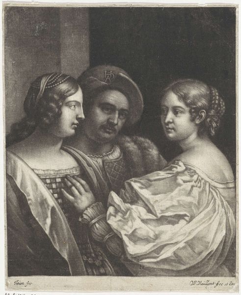 This mezzotint, "Portrait of a Young Woman with Three Children," was made by Wallerant Vaillant. The Madonna-like woman evokes the sacred archetype of motherhood. The baby wrapped in swaddling clothes recalls depictions of the infant Christ, a motif that emphasizes vulnerability and innocence. Her hand gesture is seen across time, from classical orators to Renaissance paintings, signifying guidance, blessing, and instruction. The gesture, known in ancient rhetoric as "adlocutio", reappears in countless works, each time subtly altered by the artist and the cultural moment. It’s an echo, a cultural memory embedded in our collective consciousness. Subconsciously, this gesture taps into a primal need for direction and assurance, engaging viewers with a sense of deep-seated human connection. This symbolic language transcends individual artworks, weaving a complex web of visual and emotional associations through history. It’s a powerful force that continues to resonate today, reminding us of the enduring power of symbols and the stories they carry across generations.