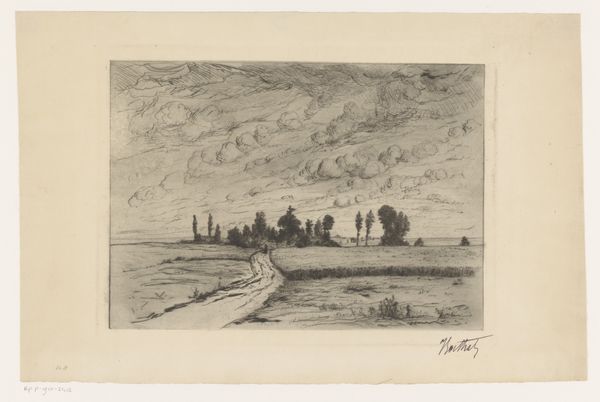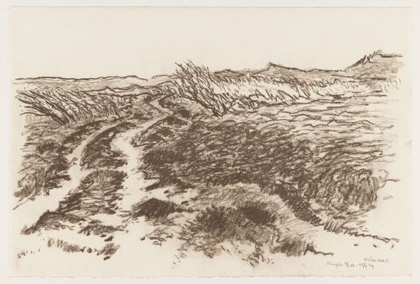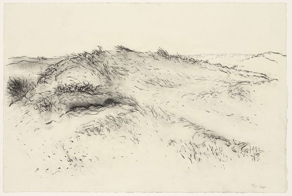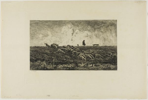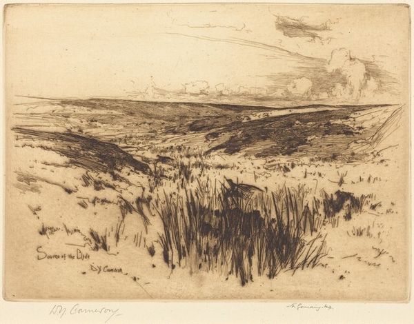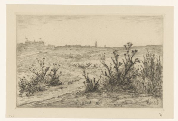 Editor: Here we have Thomas Moran's etching, "Looking Over the Sand Dunes - Easthampton" from 1880. The detail in this seemingly simple landscape is incredible, creating a very layered and textural scene. What do you notice when you look at this work? Curator: Immediately, the composition arrests my attention. Moran's skillful use of line and tone creates a dynamic interplay between light and shadow. Observe how the foreground is densely marked, contrasting with the subtly rendered horizon line. This division, while creating depth, simultaneously flattens the image, drawing attention to the surface quality. Editor: It almost feels abstract in some areas, even though it's representational. Curator: Precisely. Consider the materiality of the etching itself. The incised lines on the metal plate, transferred to paper, produce a tactile experience. Note how the varying pressures and densities of the lines not only define form but also establish a rhythm across the surface, akin to musical notation. Is it possible that the realism provides a scaffold for abstraction? Editor: That's fascinating. I hadn’t considered that the technique contributes to the overall abstraction. So it’s not just about what's depicted, but also how it's depicted? Curator: Yes. It compels us to question the very nature of representation. Is this image about Easthampton, or about the formal qualities of line, texture, and tone? This visual syntax builds meaning just as explicitly as subject. Editor: I'm starting to appreciate how much the formal elements can speak, independently of the subject matter itself. It's given me a lot to think about. Curator: Indeed. And, hopefully, a sharper eye for your next viewing experience.