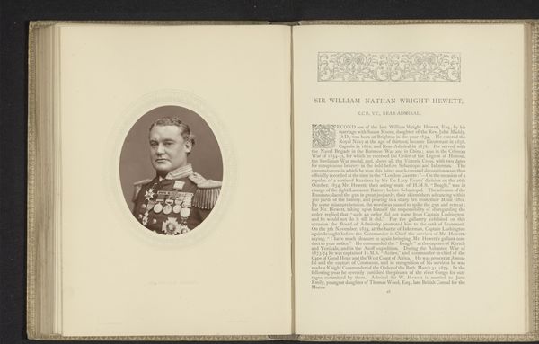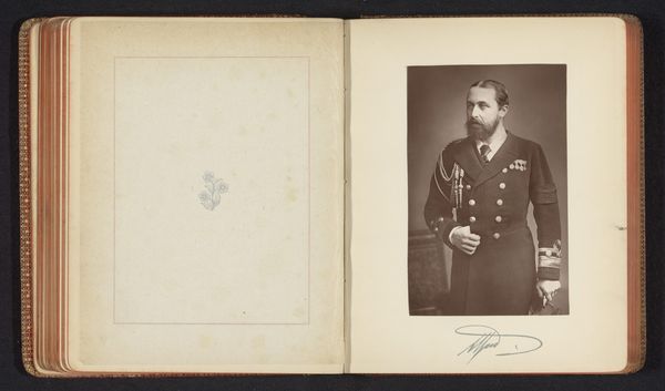 This portrait of H.R.I.H. Prince William, made by an anonymous artist, is an intriguing study in the semiotics of power and representation. The photograph, presented within the material context of an old book, captures the Prince in a formal pose, his attire laden with symbols of status. The artist uses a limited tonal range, focusing instead on the textures and forms that define the subject. The sharp lines of the Prince’s uniform contrast with the softer, more muted background, drawing attention to his figure. We see a cascade of medals and decorations which serve as visual markers of his authority. The composition of the portrait is meticulously structured, reinforcing traditional notions of hierarchy and order. The Prince's gaze is directed slightly upward, adding to the sense of distance. Through its formal qualities, the artwork invites us to consider how codes of representation shape our understanding of identity and power.