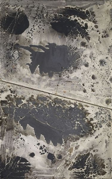 Anselm Kiefer created this textured painting titled "Black Flakes," and it presents a landscape laden with symbolic weight. The stark contrast between the dark upper register and the field of white draws the eye immediately. It’s within this field that Kiefer builds his composition. Notice how the vertical lines of the trees, or perhaps grave markers, create a rhythmic structure across the canvas. The added inscriptions, acting as textual layers, complicate any straightforward reading, inviting a semiotic analysis where the landscape becomes a field of signs. The square panel disrupts the painted surface, challenging traditional notions of the picture plane, and pushing the work into a dialogue between painting and sculpture. This panel destabilizes the conventional understanding of landscape painting. It forces us to reconsider how art engages with history and memory. Kiefer uses form to evoke a deep sense of cultural reckoning.