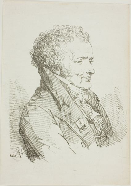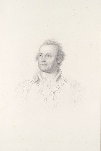 Curator: Welcome. Here we have Giovanni Paolo Lasinio's "Portret van Michele Leoni," created between 1799 and 1855 using pencil on paper. Editor: Immediately, I’m struck by the subject's severe yet thoughtful expression; a man clearly carrying the weight of his own story, sketched delicately but precisely. It whispers a forgotten melody. Curator: Indeed. Note the rigorous detailing, particularly in the delineation of form and the precise hatching that creates subtle tonal gradations. Lasinio meticulously models Leoni's features, conveying texture and volume with an almost scientific objectivity. Editor: But there's something undeniably poetic about it, despite the technical prowess. See how the light caresses the subject’s face, creating a gentle dance of shadow and highlight? It imbues him with an air of fragile humanity. I'm strangely moved by the vulnerability conveyed by such simple lines. Curator: Agreed, and that delicate approach to light plays an important formal role; it serves to articulate Leoni’s physical presence but it is also important in emphasizing the structural solidity of the overall composition. Look, too, at the relationship between line and space here. The density of the marks around the head gives a greater visual weight above the relatively blank page around the lower half of the figure, adding structural tension. Editor: You're right. And in my imagination, I’m picturing him sitting for hours as Lasinio captures his essence on paper. Each line tells a story; each shading reveals a fragment of a hidden self. It's more than a likeness; it's a visual poem. Curator: It's also, crucially, an exercise in representing likeness. The subject, after all, stares towards some distant vanishing point beyond the paper. Editor: This encounter feels almost voyeuristic. We see this man only in the imagination of someone else and what someone else wishes for us to see. Curator: So much can be uncovered through careful looking. The rigor, the beauty and the tensions—it’s all there. Editor: Yes, I walk away wondering about all those silent stories whispered on paper and left for the wind to carry across time. A privilege indeed to encounter this work.