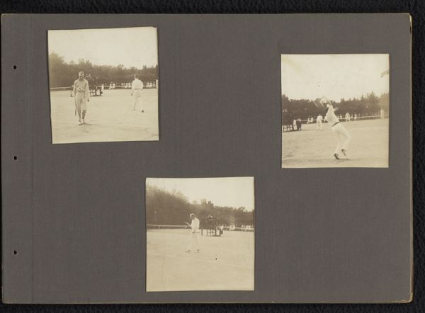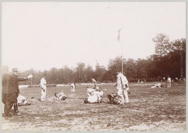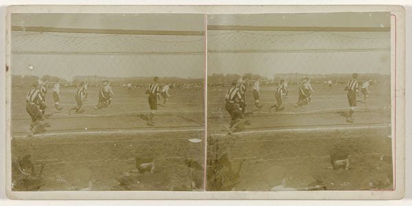 This photograph, "Ruiterspel met grote bal, Medan Sumatra," was created by Heinrich Ernst & Co. The monochromatic image presents a polo match played on a vast, open field. Notice how the composition is structured by horizontal bands of space: the flat expanse of the playing field is in the foreground, a line of trees defines the middle ground, and the sky fills the upper register. This layered structure creates a sense of depth, drawing the eye towards the central action around the oversized ball. The photograph's strength lies in how it captures a moment of colonial activity, framing it within a carefully organized visual field. The lines of sight converge, subtly hinting at the complex interplay between sport, society, and representation in colonial Sumatra. The monochromatic palette mutes the scene, inviting a close examination of the underlying power dynamics at play.