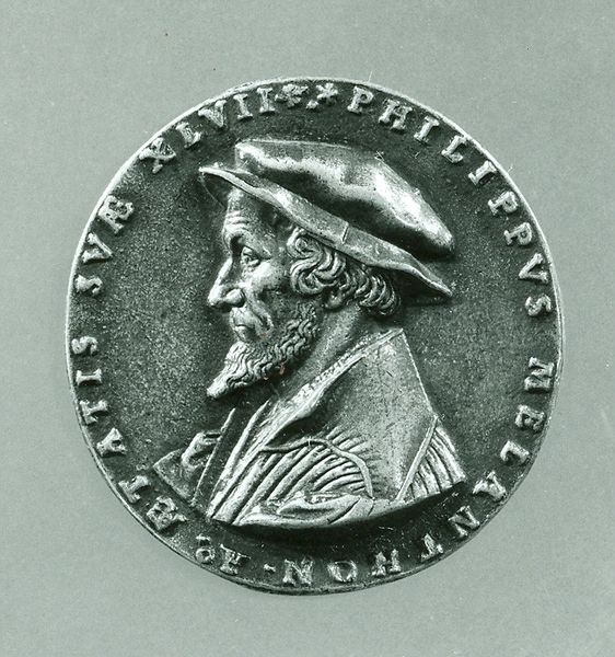 Curator: William Wyon's "The Royal Exchange," a metal relief created in 1844, is here with us today. Its intricate detailing and historical context offer much to discuss. Editor: It’s lovely. There’s something about the monochrome silvery hue against the relief's details—the man looks rather stoic, a touch imposing even! I feel a regal solemnity to it all. Curator: It's fascinating how Wyon uses metal to emulate a classical portrait. Medals like these weren't just decorative. Consider the context, it circulated within a network of power, reinforcing the Royal Exchange's authority, almost acting as mini billboards of influence and status. Editor: Yes, absolutely! But there's also such beautiful hand-work to appreciate in the design: you can see how much labor and intent went into creating just one medal. Someone probably spent days carefully incising this portrait and the text around the circumference! It’s lovely and a bit astonishing to hold such focused care in your hand after so long. Curator: The medal's production involves a material and social relationship: from sourcing the metal to the skilled labour employed in the relief work. It all signifies a complex economic narrative beyond the simple aesthetic of the image. Editor: True! Though, the subject does project a stern, unsmiling dignity that hints at the serious business occurring inside those walls, right? There’s a lack of spontaneity; the overall effect makes one consider their place. Curator: Precisely. Wyon was strategically showcasing a space governed by certain social rules, a monument to established capitalistic endeavors. Editor: A tiny mirror reflecting something greater, maybe even grander... I find it really interesting to notice how an object seemingly limited by form ends up telling such a grand story. Curator: Exactly. The story extends into an entire history of production and consumption. Editor: That we can read something new, just beneath the reflective surface, long after its creation makes me happy, almost joyful. Thank you, Wyon!