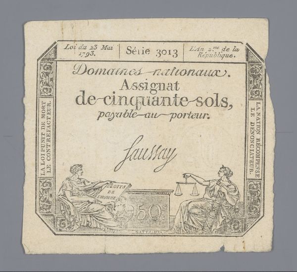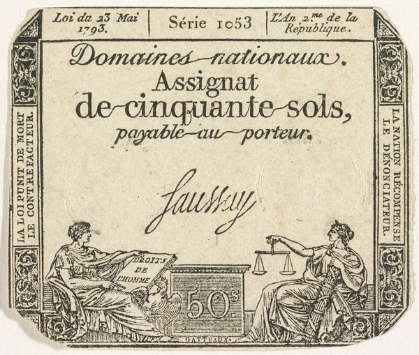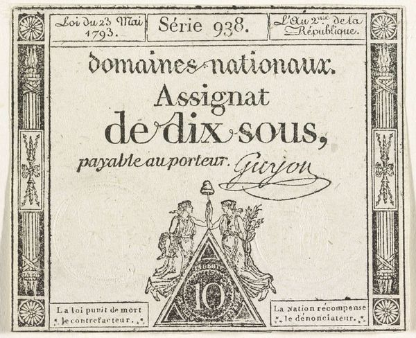 This is an assignat of 15 sols, created in 1793 by Domaines nationaux, during the tumultuous period of the French Revolution. The immediate visual impression is one of stark, functional design, dominated by bold typography and simple graphic elements. The composition is rigidly structured, dividing the small rectangle into defined zones of text and symbolic imagery. Note how the central inscription of value, "quinze sols payable au porteur", is emphasized through size and placement, anchoring the design. Flanking this, we see allegorical figures, symbols of justice and liberty, rendered in a neoclassical style that was so popular during the period. The stark contrast of black ink on white paper heightens the graphic impact, reflecting the urgency and utilitarian purpose of this form of currency. Despite its modest size, the assignat functions as a potent symbol, revealing the intersection of art, economics, and political ideology in revolutionary France. Its aesthetic form is inseparable from its intended function within a society undergoing radical change, reflecting the philosophical and political discourse.