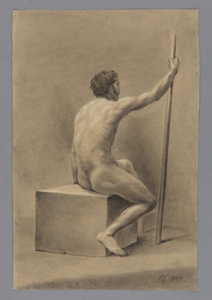 Curator: This is "Kneeling Male Nude, Seen from the Side (1st prize 1809)" attributed to Henricus Franciscus Wiertz, likely created around 1809. It's a pencil drawing on paper. Editor: It strikes me as rather somber. The figure's bowed head and clasped hands—bound, it appears—project a feeling of submission or perhaps defeat. The muted grayscale palette reinforces that mood. Curator: Yes, the use of a kneeling nude was common for academic art, meant as a study for history paintings or other large-scale works that demonstrated a mastery of the human form and its classical ideals, this piece was actually awarded first prize in 1809! The nude in art at this time also reflects the complicated intersection of art education, public morality, and neo-classical ideals following the French revolution. Editor: Note how Wiertz employs chiaroscuro to sculpt the figure's musculature, imbuing it with volume and a palpable sense of weight. The strong contrasts illuminate the back and shoulder, while the head and extremities remain partially obscured, focusing our attention on the subject’s emotional center. It’s a very effective deployment of line and shading to convey both physical form and psychological state. Curator: Absolutely. This type of study drawing became critical to larger societal discussions about art's public function, its relation to the burgeoning nationalism present in Europe during the early 19th century. How could it continue to operate in a post-revolutionary world? Wiertz shows us how such drawings walked the line between artistic merit, social symbolism and public accountability. Editor: It certainly showcases a control of form; a mastery of representing the human body through tonal variation. To think, a single pencil could produce this full, rounded image of life itself. Curator: Considering the Academy context and time in history, the nude subject could have served also as the object of idealized social hopes. Perhaps art would represent freedom, or become associated with national values of strength, virtue, and beauty during a tumultuous moment in Europe's own becoming. Editor: An intriguing perspective that gives the piece further depth and context. I now see this figure less as solely an object of artistic study, and more as a symbol caught between ideals of revolution and nation. Curator: Exactly, art serves as an ongoing barometer of culture's temperature, recording subtle pressures over decades and movements.