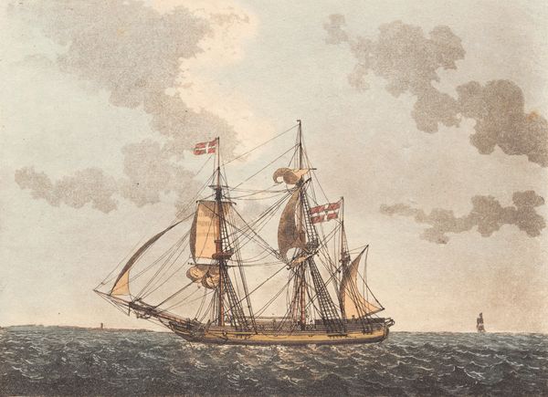 Niels Truslew created this watercolor and etching print of two ships around the late 18th to early 19th century. The composition is neatly divided: two ships cut through the water, while above them, a muted sky fills the remaining space. The color scheme is restrained, dominated by earth tones and pale blues, creating a serene, almost melancholic atmosphere. The ships are rendered with careful attention to detail, their forms defined by a network of lines that articulate masts and sails. Truslew's technique emphasizes clarity and order, typical of the Enlightenment's focus on reason. The image is more than a simple depiction; it is a structured representation of maritime life. We might consider how the orderly arrangement of the ships mirrors the era’s broader cultural values. This etching invites us to consider how art in the Age of Reason used formalism to convey ideas of order and structure in a rapidly changing world.