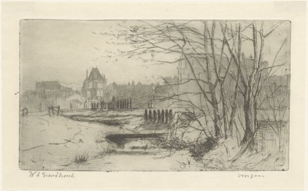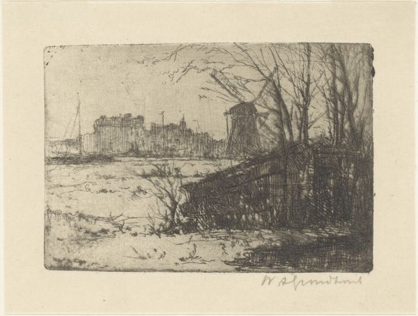 Willem Adrianus Grondhout made this etching called 'Sloot in de Binckhorst in Den Haag', though we don't know exactly when. Look how the lines are used to suggest depth and texture, like the scratchy, bare trees in the foreground against the buildings further back. It's like he's feeling his way through the scene, line by line. The etching is full of subtle details. The contrast between the rough textures of the foreground and the more refined shapes of the buildings creates a kind of visual tension, doesn't it? And there's a real physicality to those lines; you can almost feel the artist's hand moving across the plate. I am drawn to the marks in the bottom left of the page, the subtle shading that gives way to blank space. I wonder what kind of tool he used to achieve that level of nuance. There's something about Grondhout's way of seeing that reminds me of Whistler, in how he captures a sense of atmosphere and mood with such economy of means. It's a reminder that art is always in conversation with itself, echoing and reinventing ideas across time.