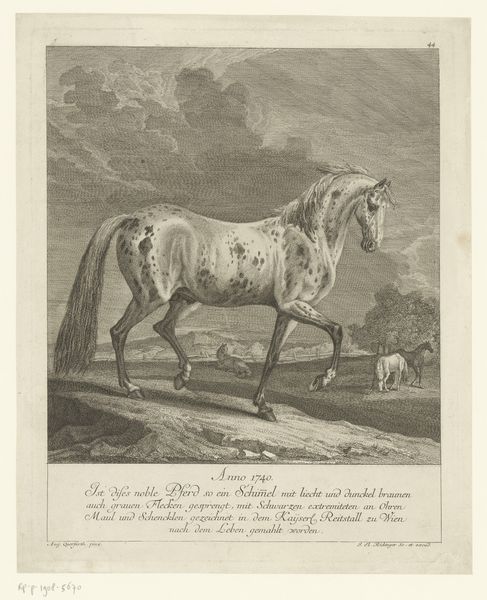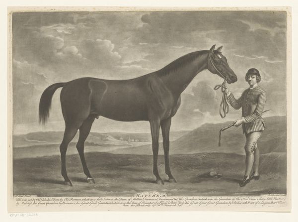 Meno Haas made this engraving, "Hesten 'Turcmainatti'," which translates to "The Horse 'Turkmen'," presumably in Denmark, sometime around the late 18th or early 19th century. Here, Haas presents us not just with an image of a horse, but a portrait of status and power in the Age of Enlightenment. The Turkmen horse breed was prized for its speed and endurance, qualities highly valued by the aristocracy for transportation, sport, and warfare. The horse is meticulously rendered, its muscular build and elegant stance showcased against a backdrop of cultivated fields and distant hills, implying land ownership. Prints like these circulated among a wealthy elite, reinforcing a culture of admiration for bloodlines and landed gentry. By understanding the historical context, we can better interpret the image not merely as a depiction of an animal, but as a reflection of the social hierarchies and values of its time. Researching stud books, agricultural practices, and even estate records, might tell us more.