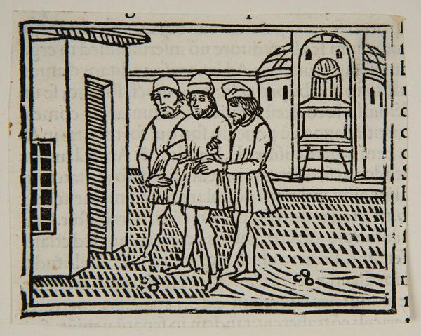 Curator: This is an intriguing woodcut titled "Book XXXVIII.49-50. Scipio Asiaticus (Lucius Cornelius Scipio) convicted of embezzling and ordered to prison, his relations contribute to his fine". Editor: It feels so stark, doesn't it? The sharp lines and stark contrast evoke a sense of grim finality. Curator: Indeed. The symbolic language is rich. Note the doorway, a potent symbol of transition, contrasting with the man counting coins, embodying earthly concerns and consequences. Editor: The figures walking towards the doorway are fascinating. They all seem connected, yet each is isolated within the composition. Is that a shared guilt, perhaps? Curator: It could represent shared responsibility, yes. Or possibly the burden of familial loyalty influencing the formal relationships. A powerful piece. Editor: Absolutely. It’s a haunting depiction of justice, visually echoing moral constraint and the consequences of greed.