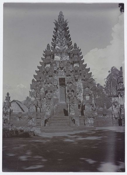 This photograph of the Eindawya Pagoda in Mandalay, Myanmar, was taken by Felice Beato. Notice how the conical form of the pagoda dominates the composition. The layered tiers create a rhythm that draws the eye upward toward the spire. Beato's use of light and shadow models the architectural forms. This technique emphasizes the pagoda’s three-dimensional presence. This creates a sense of depth and monumental scale. The tonal range in the sepia tones reflects the texture of the building materials, contrasting the smooth surfaces of the stupa with the rougher textures of the surrounding structures. The lone figure on the right grounds the photograph with a human element. It offers a sense of scale that enhances the pagoda's grandeur. Beato carefully frames the pagoda. He uses both geometric precision and cultural insight to capture the essence of this sacred site. It’s a visual document and a work of art, intertwining the architectural and the spiritual.