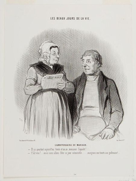 Honoré Daumier created this lithograph, "L'anniversaire du mariage," using the stark contrast of line and shadow to sculpt the figures from the blank page. A couple occupies a shallow pictorial space; their forms are rendered with a network of hatching that emphasizes the weight and texture of their clothing. Daumier was a master of social commentary, and here, the composition’s geometry speaks volumes. Note how the woman’s upright posture and the newspaper she holds create a vertical thrust, contrasting with the slumped posture of the man beside her. This arrangement suggests a dynamic of power and domesticity. He is literally and figuratively weighed down. The lack of background detail forces us to focus on these figures, making the subtle gestures of their faces all the more telling. The power of Daumier's lithography lies in its capacity to destabilize traditional notions of the heroic or the beautiful. It presents us with the everyday, inviting us to decode the signs of social life embedded within.