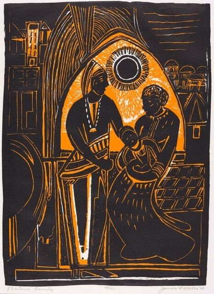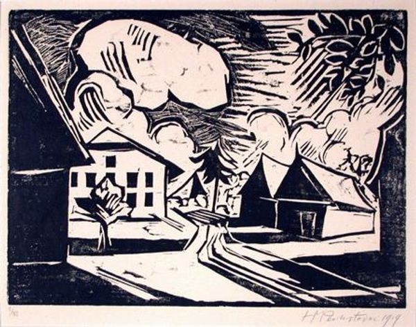 Dorrit Black created this print, titled "The Eruption," employing bold lines and flat planes of color. The composition, with its stark contrasts between light and shadow, and unnatural perspective, evokes a sense of unease, of impending drama. Look at how Black reduces figures and forms to their most basic shapes; the silhouettes of people, the simplified structure of the building. This abstraction serves not to clarify, but to amplify the emotional impact. The jagged, red lines cutting across the sky mimic fissures in the landscape, visually signaling an eruption of internal turmoil. The artist seems less concerned with accurately representing reality than with conveying a visceral feeling of disruption. This print destabilizes the viewer’s expectations, inviting us to question the nature of our surroundings. It offers a space for contemplating the fragile balance between the external world and our inner lives.