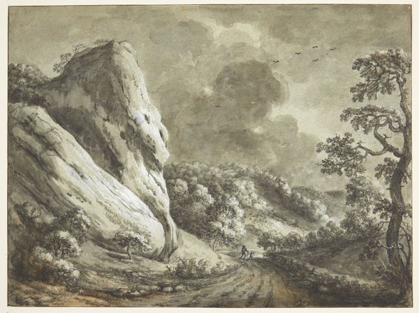 Gherardo Cibo rendered this landscape with pen and brown ink on blue paper. Born in Italy in 1512, Cibo was an artist-naturalist, and his landscapes combine direct observation with the artistic conventions of his time. This landscape presents an idealized vision of nature, echoing a growing interest in the natural world during the Renaissance. The two figures in the foreground, dwarfed by the scale of the landscape, invite us to consider humanity’s place within the natural order. The arch itself becomes a symbol of nature's grandeur and enduring power. Cibo’s decision to depict the landscape in such detail reflects a humanist desire to understand and document the world. This drawing invites us to reflect on the historical relationship between humanity and nature. Cibo’s artwork reminds us of the Renaissance’s evolving perspectives on identity, knowledge, and our place in the world.