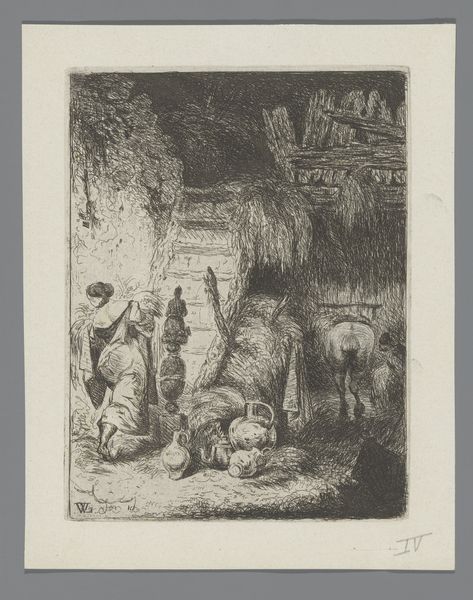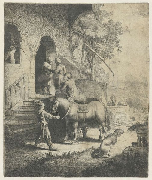 Curator: Charles Jacque produced "The Rider" sometime between 1840 and 1850. It’s currently held here at the Met. It is executed using etching and perhaps some watercolor washes over the print to add nuance to the grayscale image. Editor: I'm immediately struck by the stark contrast and the somewhat melancholy mood. There's a distinct air of Romanticism clinging to the whole scene. The use of shadow really draws me in. Curator: Indeed. Look closely, and you'll see how the etching process allows for fine lines and detailed textures, essential for depicting the varied materials here: the stone of the building, the fur of the horse, even the different fabrics worn by the figures. It really speaks to the skill required of printmakers in the mid-19th century and to their value in disseminating imagery to a wider public. Editor: Absolutely. The way the woman is positioned near the doorway – almost presenting a drink or food on a tray – evokes age-old archetypes of hospitality, or perhaps even temptation. And then, the rider… back turned, almost stoic. It brings up the broader symbolism of journeys, departures, and even the vulnerability of stopping during a journey. Curator: Do you think the image hints at feudal relationships? The building, maybe a way-stop inn? Editor: Perhaps, the overall scene, while genre-like, taps into the symbolism of provision and reliance. The building itself acts as this looming, protective symbol and suggests shelter and continuity. Curator: And while we can consider these broader implications, the reality is this image, as a readily-producible print, becomes a commodity. Homes could acquire images quickly to add style to their wall spaces! Editor: Precisely! And I'd say we both agree the layering of symbol and practicality are quite strong! Curator: Absolutely, an exciting confluence. Editor: Thanks! This conversation has provided another dimension in understanding the power and endurance this particular artwork carries!
