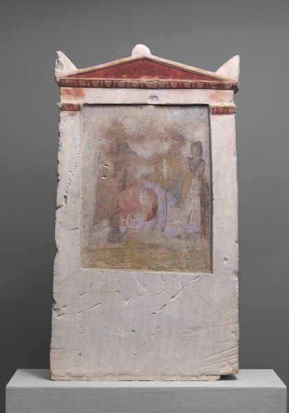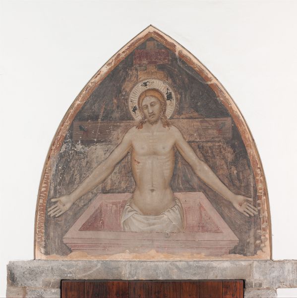 Curator: Welcome. Before us is an early 14th-century tempera on wood panel, titled "Pietà." Its creator is currently unknown. What are your immediate impressions? Editor: Somber. The subdued palette and the figure’s closed eyes evoke a powerful sense of sorrow and resignation. There's also a compelling intimacy in the composition. Curator: Indeed. Observe how the artist utilizes a limited range of colors, primarily earth tones and muted golds. The stark chiaroscuro intensifies the emotional weight. The composition is equally considered. Editor: Yes, but I read that darkness differently. Given its context – likely created for private devotion during a period of immense social upheaval with famine, disease, and constant warfare throughout Europe, particularly in Italy – this Pietà speaks volumes about collective trauma. It presents not just religious sorrow but the shared suffering of communities. Curator: I see your point. But look at the craftsmanship in the rendering of Christ's torso; note the delicate brushstrokes creating subtle gradations in value to describe the planes of his form. Editor: And those subtle gradations further enhance the vulnerability conveyed. The positioning of the hands too suggests restraint, as though preventing any further infliction of harm. Considering the prevalent patriarchal structures of the era, the emphasis on his bare chest renders the figure explicitly vulnerable to social forces, marking an exploration of masculine sorrow rarely portrayed in contemporary depictions of that time. Curator: Perhaps, but to analyze it within its formal Byzantine style, it serves as an exemplar of iconic representation aiming for transcendence, directing our gaze beyond material suffering to an ethereal realm. The meticulous details within that realm act to instill both awe and wonder in the devotee. Editor: While those iconographic elements cannot be overlooked, let’s also not disregard how that aspiration for the ethereal may represent the yearning for release from lived earthly hardships, reflecting historical realities and social yearnings during an age of unrelenting despair. Curator: A nuanced perspective, placing the artwork within multiple interpretative dimensions, simultaneously, a methodology which reveals ever-deeper truths. Editor: Precisely. Artworks resonate most strongly when we see them as both reflections and active agents within history.