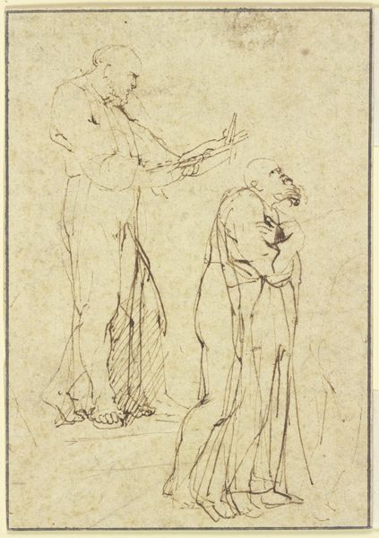 Curator: Here we have George Romney’s pencil drawing, "A Family and Figures in a Ring Dance," dating from between 1744 and 1767. The red chalk lends it a warm, almost fleeting quality. What strikes you most about it? Editor: I’m really drawn to the almost frenetic energy in the lower sketch. There’s a real contrast between the stationary, staged family above, and the swirling figures dancing below. I’m curious, though: what can we tell from Romney’s choice of material, just a pencil sketch? Curator: Absolutely. This isn’t a finished product, right? It's about Romney’s labor: quickly capturing multiple figural arrangements, the economics and efficiency matter. These rapid sketches are tied to social changes. This suggests that Romney likely churned out numerous drawings, and so was exploring narrative themes that might gain future patronage. Look at the means of production: a cost-effective way for an artist to explore a variety of compositions before committing to a more time-consuming oil painting, or commissioned work. Does that frame it differently for you? Editor: It does. Thinking about it as a product, intended to attract patrons, suddenly makes me see the dance not as pure joy, but also perhaps as a performance *for* an audience. So, the material implies that this is linked to marketing practices? Curator: Precisely. We move away from pure artistic expression and think of artistic production in relation to 18th-century market conditions. Notice, even, how economical it is by utilizing the same sheet to depict both scenes, therefore reducing production cost. That tension between ‘high art’ and commerce becomes very interesting when we consider this drawing. Editor: So by focusing on Romney’s process, the materials themselves, we understand more about art consumption during this time. I hadn’t considered artmaking as piecework quite this explicitly! Curator: Exactly. That’s the materialist approach; grounding art historical interpretation to making, materiality, and societal functions.