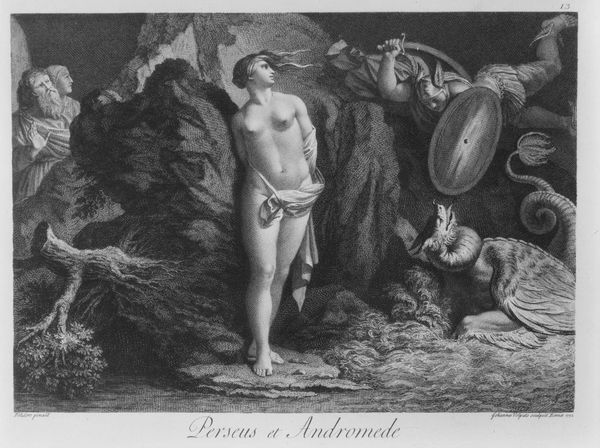 Curator: Here we have "Perseus and Andromeda", an engraving by Giovanni Battista Piranesi. There's no firm date on it, but we believe it fits comfortably within his broader body of work. What's your first impression? Editor: Visually striking. The stark contrast in blacks and whites creates an immediate drama. Andromeda's luminous form is particularly arresting against the shadowed chaos surrounding her. It's very dynamic, very graphic. Curator: Absolutely. Piranesi situates this classical myth within a visual language ripe with tensions between power, vulnerability, and heroism. Note the spectators at the top-left of the piece. Their gaze constructs and solidifies the social norms associated with public spectacles of this kind. How might those unspoken dynamics influence our understanding of Andromeda’s ordeal? Editor: Interesting. I was immediately drawn to the texture achieved purely through line. Look at how he suggests the scales of the sea monster versus the smoothness of Andromeda's skin, or even the fabric draped over her. It's almost sculptural. Curator: Exactly. The composition invites questions about the representation of women within classical narratives, particularly in moments of peril and rescue. Andromeda embodies themes of purity and victimhood while simultaneously occupying space as a symbol of beauty and resilience. Her nakedness speaks to the objectification and vulnerability inherent to women in historical, mythological contexts. Editor: That focus on form, the pure manipulation of line to create depth and volume... it transcends any overt political statement. Though I can appreciate you looking at the artwork through a contemporary lens. Curator: Understanding the artwork, in our present, through the multiple intersecting elements related to the subject’s agency and imposed constraints encourages conversations that reverberate even now. Even without overt declarations of sociopolitical belief from the artist, a dialogue on the visual power dynamics feels productive here. Editor: A point well taken. I may remain more focused on Piranesi’s artistry, but acknowledging those historical conditions does give added context to the image and helps me appreciate its emotional resonance. Curator: Ultimately, engaging with these pieces demands sensitivity to the many factors that make each so enduring and challenging. Editor: Indeed. There's more here than initially meets the eye.