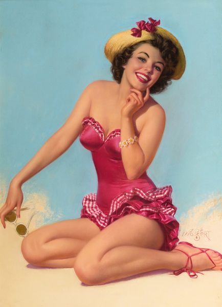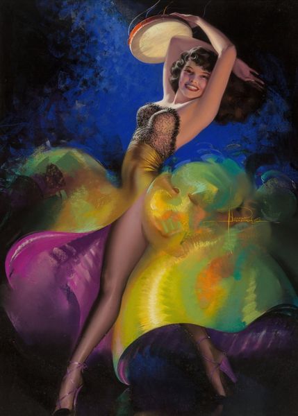 Zoe Mozert made this promotional image of the actor, Jane Russell, in oil paint, but the exact date is unknown. The color palette is all about drama – that deep blue background offset by the stark reds and yellows of Jane’s dress and top. You can see how Mozert has played with the textures, creating a tension between the smoothness of Jane’s skin and the rough strokes behind her. The way she handles the edges is what gives this piece its real energy. Those blurred lines around the figure make it feel like she’s about to move, to jump right out of the canvas. Look at the shadow beneath Jane’s legs, it’s a soft, hazy blur of dark brown, almost like a cloud. It gives the whole composition a slightly surreal feeling, as if she’s floating in this imagined space. Mozert was working around the same time as pin-up artists like Gil Elvgren, but she brings a certain sensitivity to the genre. She invites us to ponder the interplay of light and shadow, and the emotional impact of color, rather than just presenting us with a fixed image.
