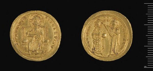 Editor: This is a gold Coin of Justinian II. It’s really striking how the imagery feels both sacred and powerful. What symbolic weight do you see in these images? Curator: The coin speaks volumes about the Byzantine era. It's an immediate echo of cultural memory. Notice the cross, the figures; these aren't just portraits, but potent symbols connecting Justinian to both divine authority and dynastic succession. Can you sense the message it was meant to convey? Editor: I see how the symbols reinforce his authority. It’s interesting how something so small can carry such a big message. Curator: Exactly! It's a tangible piece of history, reflecting an entire worldview through carefully chosen imagery. I'm glad you see it too.