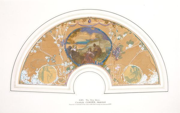 Curator: Looking at "Fan-'Amore Scene-Verno Martin'," dating from the 19th century and held at the Minneapolis Institute of Art, I’m immediately struck by its elegance. The pastel hues create such a soft, dreamlike atmosphere. Editor: The landscape scene does indeed have a particular lightness. Tell me, what can you share about the processes and conditions surrounding its creation? A fan seems like a humble support, so I'm interested to learn what purpose it would have served. Curator: These painted fans were actually highly fashionable accessories in 19th-century France, especially those that depicted romantic or pastoral scenes. This mixed-media work is likely an oil painting, miniature, used as part of the wider manufacturing process of functional, decorative objects intended for bourgeois consumption. Its Rococo styling harkens back to earlier periods, with that courtly emphasis on leisure and romance, although by this point, it would likely have served to highlight the refined and upper-class taste of its consumer. Editor: The figures definitely evoke that aristocratic spirit, don’t they? They’re arranged so deliberately within the composition, almost like performers on a miniature stage, inviting narrative analysis through form alone. The artist employs delicate brushwork in creating an atmospheric scene, even given the constraints of the small and curved plane of a handheld fan, they created depth with hazy, bluish distance effects, contrasted to sharply drawn figures, all while conforming to certain design expectations, and therefore production practices of the time. Curator: Precisely! It showcases the skill required to produce desirable objects during the period. Furthermore, fans have often carried additional social significance - for example, they are used as communicative objects and instruments. Even without access to extensive background details, a formal understanding of their structural composition still creates compelling viewing, even now. Editor: Absolutely. The craftsmanship is undeniable, even across these many years that it’s existed, even separate from the original social situations it engaged with. Ultimately, looking closer at how its intrinsic design and manufacturing come together brings us an aesthetic appreciation from a socio-economic vantage. Curator: Yes, looking at the relationship between aesthetic choices and commercial conditions deepens my understanding of objects.