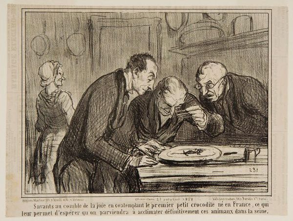 Editor: We're looking at Herbert Lawrence Block's 1950 graphite drawing, "Five Hundred Million of Them - All Expendable." The title's pretty bleak, and the figures around the table have these almost sinister, scheming expressions. The hammer and sickle on the wall definitely sets a tone. What do you see in this piece? Curator: The composition presents an immediate tension. Note how the table dominates the foreground, creating a barrier, almost a stage, upon which these figures act. The starkness of the graphite amplifies the gravity of the subject. Consider the lines of the map versus the implied aggression of the leaders' gestures. The contrast is not accidental. Editor: So you're saying the simplicity of the medium highlights the complexity of the political message? Curator: Precisely. The reduction to line and tone focuses the viewer's attention on form and spatial relationships. See how the sharp angles of the table and the hammer and sickle emblem juxtapose with the rounded forms of the leaders, creating visual discord. What implications does this dissonance present? Editor: Maybe it's a way of showing the conflict between the ideology and the individuals pushing it forward? Curator: An astute observation. The artist invites us to analyze the anatomy of power through the framework of stark shapes, tones and expertly crafted lines. There is nothing accidental in this careful balancing act of form. Editor: This has definitely made me think more about how the artist’s choices really shape the meaning beyond just the obvious subject matter. Curator: Indeed, form contains substance, particularly in the arena of art which makes astute social commentary.