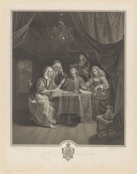 This image by Johann Georg Wille, dating back to the 18th century, presents a man and two women indoors. The setting is a domestic space marked by a table set with reflective objects, and the clear presence of a bed behind a standing woman. Consider the visual weight of these common domestic objects; in iconography, reflective objects can symbolize vanity, but also introspection. They also act as portals, allowing the viewer to move between symbolic and literal meanings. The bed’s heavy presence draws the eye, connecting the scene to themes of intimacy and privacy. But it's not just the objects that speak, observe the gestures: the standing woman's posture suggests solemnity or concern, contrasting with the seated figures, whose interaction seems more intimate. Such arrangements and gestures remind me of earlier Renaissance depictions of the Annunciation, where similar postures convey moments of significant disclosure or decision. These echoes across centuries reveal how certain visual languages persist, shaped by collective memory.