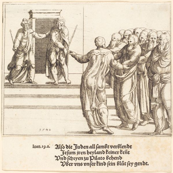Curator: This engraving, "The Three Kings Tell Herod of Christ's Birth," was created by Augustin Hirschvogel in 1549. It's a beautiful example of Northern Renaissance printmaking. Editor: My first thought? Stark. Austere. The linework is so precise, it almost feels… surgical. And everyone looks a little anxious, even the camels in the background! Curator: That anxiety is palpable, isn't it? Herod, sitting at the left, is troubled by the news, a sentiment compounded by the context of 16th century anxieties around religious reformation and political instability. Notice how Hirschvogel contrasts Herod's enclosed, shadowy space with the expansive landscape behind the kings. Editor: Exactly. The Three Kings stride toward Herod with such purpose! You can practically hear the sand crunching beneath their feet and the jingling of their...daggers? Why do they all have swords? Curator: Good question. The swords add an element of authority and power, essential to their status as kings, but also maybe foreshadows the conflict to come: the slaughter of the innocents after they reveal Jesus's imminent birth. Hirschvogel highlights a moment brimming with historical and allegorical meaning. Editor: That's dark. I was too caught up in the overall linear aesthetic. Now that you mention it, you’re right, that sword detail DOES shift the feeling. Did many people actually see this print, when it was originally made? Curator: Prints like these were instrumental in disseminating biblical narratives and moral lessons to a wide audience. Its circulation reflects a period where religious imagery became increasingly accessible, influencing individual faith and challenging traditional religious authority. Editor: Art for the masses! Though those masses back then probably didn't experience this through headphones on a self-guided tour. Speaking of, wow...time flies! I saw an unsettling mood captured in spare lines; you located it in broader histories. Fascinating. Curator: And your intuitive response reminded us of the immediate emotional impact art holds. A rewarding discussion, indeed.