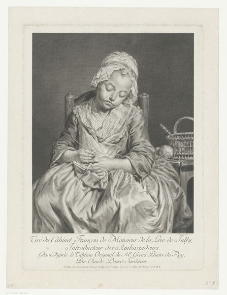 Curator: An engraving by Jean Jacques Flipart from 1763, titled "Meisje met bol wol en kat." What do you notice? Editor: Well, first off, the texture in this engraving is incredible. The way he's captured the light on the girl's dress and the fur of the cat... it feels almost lifelike despite being black and white. It makes me wonder how he achieved this effect through line alone. What do you think is the key compositional element in play? Curator: I see it largely within the contrasting orientations—horizontal linearity across the figure’s garment, punctuated with a strong diagonal, falling left to right. The artist balances positive and negative spaces; note how the dark background intensifies the intricate textures of the foreground elements, as it creates emphasis. Can you identify how form is constructed in terms of semiotic organization and distribution? Editor: I suppose the careful arrangement of shapes and textures constructs a clear visual hierarchy, like the concentration of detail and activity around her face drawing our eye, versus the darkness of the upper background fading back. Curator: Exactly! The semiotics of shape is pivotal for decoding visual artworks: Observe how linear form structures rhythm of composition across the scene and elements are constructed across horizontal and diagonal orientations. The strategic placement is meant to highlight specific areas in an attempt to command the audience’s perception of a pictorial order. Editor: This way of deconstructing elements reminds me how essential the relationship between form and composition becomes. I see Rococo paintings very differently now, knowing I can decode a structured method with semiotic analysis! Curator: Yes, that's a valuable takeaway. By studying form we can unravel structure!