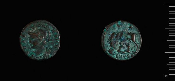 Editor: Here we have an artifact, a coin of Constans, originating from Alexandria. The patina gives it a lovely, almost dreamlike quality. What do you see when you look at this little window into the past? Curator: Well, it whispers stories, doesn't it? The wear on the metal, each tiny scratch, is a testament to hands long gone. I see power, of course, in Constans' profile, but also fragility – the empire wouldn't last forever, would it? The figures on the reverse, perhaps soldiers, seem a little less grand when you consider the whole picture. What do you make of the figures on the reverse? Editor: I hadn't really considered them as individuals within a much grander narrative. Thanks for that. Curator: Art makes for great conversation, doesn't it?