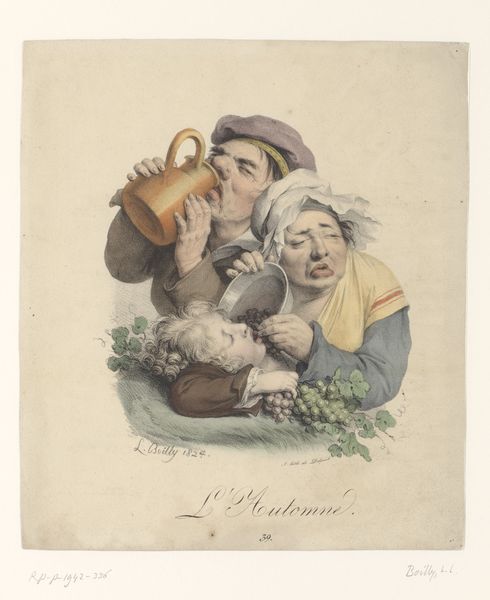 Louis Léopold Boilly created this artwork called 'Herfst' in 1829. The grapes, the wine jug, and the figures themselves are more than simple representations of a harvest. They are powerful symbols deeply rooted in cultural memory. The ripe grapes represent abundance, while the flowing wine evokes a state of ecstatic abandon. These motifs find echoes in Bacchic festivals, ancient rituals celebrating Dionysus, the god of wine. Consider how Caravaggio portrayed Bacchus – his flushed face and grasping hand echo the same primal enjoyment we see here. The motif of grapes has appeared through history, shifting in meaning. It's resurfaced, evolved, and taken on new meanings in different historical contexts. The emotional intensity of the scene engages viewers on a deep, subconscious level. It is a testament to the enduring power of cultural memory.