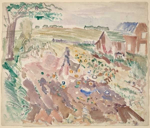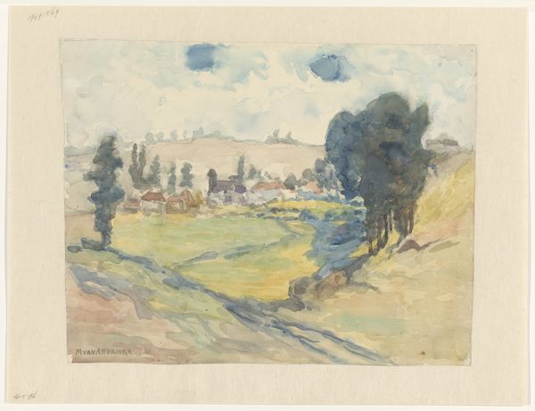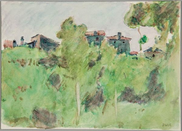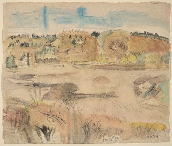 Curator: We're looking at Émile Bernard's "Paysage aux alentours de Pont-Aven," a watercolor and colored pencil piece from 1889. Editor: The initial mood is quite somber, wouldn’t you say? The muted colors, the sketch-like quality. There's a dreamlike, almost melancholy feel about it. Curator: Considering Bernard's milieu, a place like Pont-Aven would have teemed with artistic experimentation, impacting his material and aesthetic choices significantly. These post-impressionists were investigating the very nature of seeing. Editor: Absolutely. Look at how Bernard represents those figures, possibly peasant women. Their dark clothing contrasts sharply with the golden-green landscape, giving them a symbolic weight. Do they represent tradition against change, or some kind of mourning for the past? Curator: What's interesting here is that by reducing figures and forms to such essential lines, Bernard explores the raw process of representation. The blurring of watercolor shows us how much the medium itself is telling the story, moving from impressionistic to abstracted forms through the materiality of it. Editor: The rain in the background certainly draws me in. It isn't simply weather, is it? Instead it becomes a visual metaphor; a symbolic weeping, a subtle warning, perhaps even an evocation of purification. Curator: I would venture that such abstraction, evident in both subject and medium, questions not only art's making but also consumption's effect on artistic value, since its deliberate lack of conventional realism flies against that established order of landscape painting. Editor: But by simplifying the scene, he allows archetypes to emerge. Consider the trees—they're almost primal forms. The composition itself has a familiar rhythm, offering both comfort and, strangely, discomfort. Curator: And in thinking of his working process as a conscious process of abstracting the already available imagery through drawing and watercolor paints, Bernard turns art making itself into commodity assessment. It questions production in relation to inherent symbolic value as one becomes reliant on another. Editor: What fascinates me is how Bernard takes the observed world around Pont-Aven, infuses it with symbolism that can resonate across eras, inviting us to contemplate on cycles and feelings that might otherwise pass unnoticed. Curator: True, that’s art-making. But its essence, it's value is not about a singular symbol—it lies in asking what labor constructs an item so valued, and whose vision it truly represents to begin with. Editor: Ultimately, I come away pondering on memory and transformation; Bernard coaxes me to regard how landscapes may evolve but symbols—both intimate and cultural—persist across the generations.