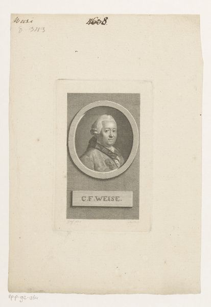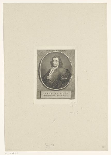 Alexis Loir created this portrait of Petrus d'Andrieu using etching techniques. Immediately, the contrast between the detailed central oval and the surrounding blank space draws the eye. The subject, framed within the clean lines of the oval, is rendered with meticulous detail—notice the texture of his hair and the subtle gradations of tone that model his face. The background of the oval is crossed by a grid pattern, this semiotic system creates a sense of depth but also a conceptual framework, suggesting the subject is not merely represented but analyzed and categorized. The oval itself acts as a structure, setting the figure apart, turning the sitter into an object of scrutiny. Consider how the image's structure mirrors the intellectual climate of the time, where classification and rational inquiry shaped artistic expression. The portrait becomes more than a likeness; it is a study in form, engaging with contemporary ideas about knowledge and representation. Art is, after all, an ongoing dialogue between what we see and how we interpret it.